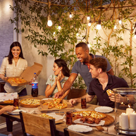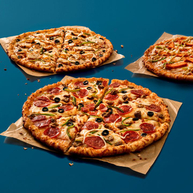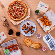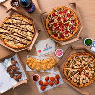 3 بيتزا وسط، بطاطس ودجز، أصابع الخبز بالجبنة، 8 قطع أجنحة دجاج، و 2.28 لتر مشروب غازي