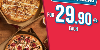 Get 2 large pizzas for AED 29.90 each